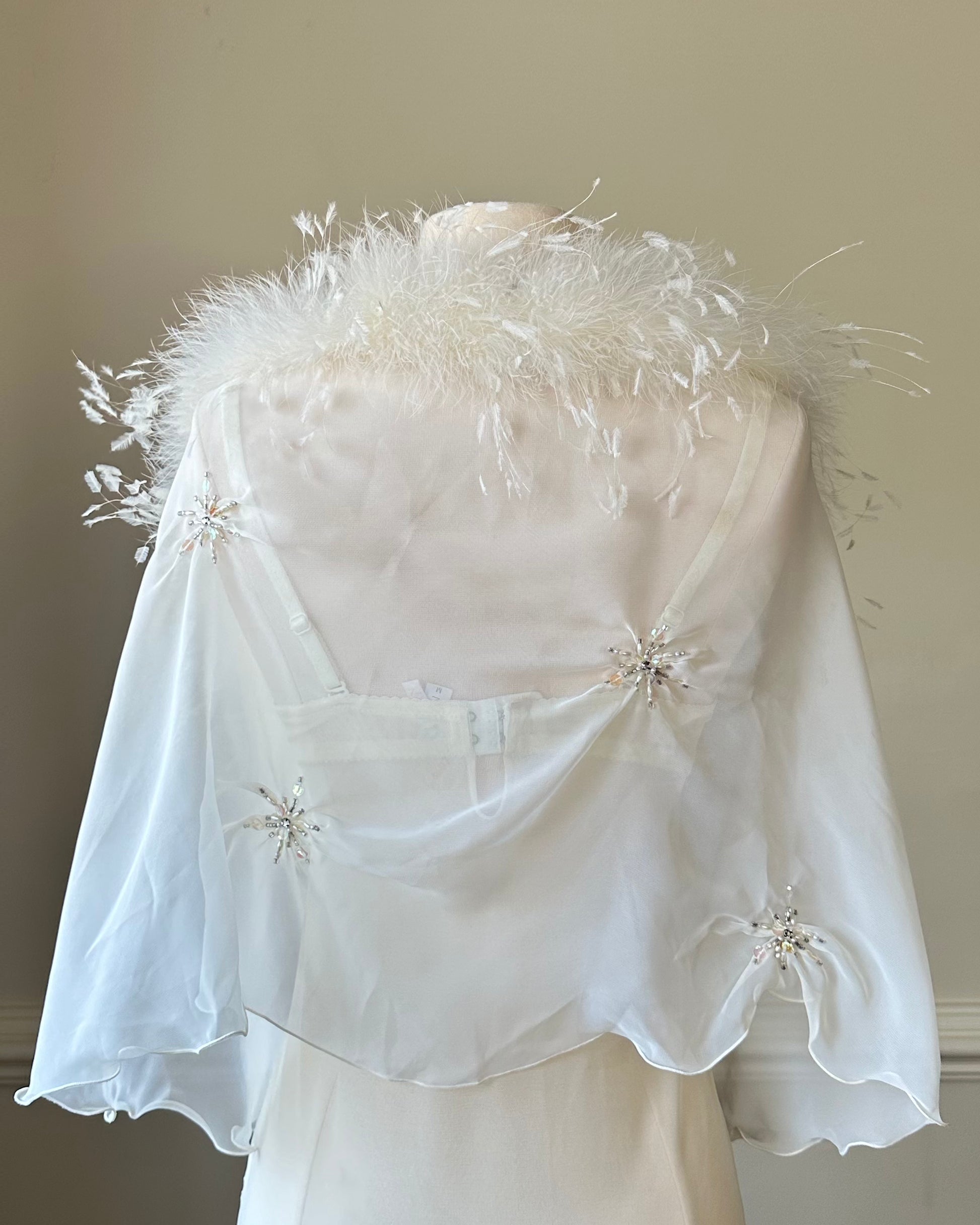 - Beautiful Japanese fur cape featuring sheer chiffon fabric with chunky white fur collar