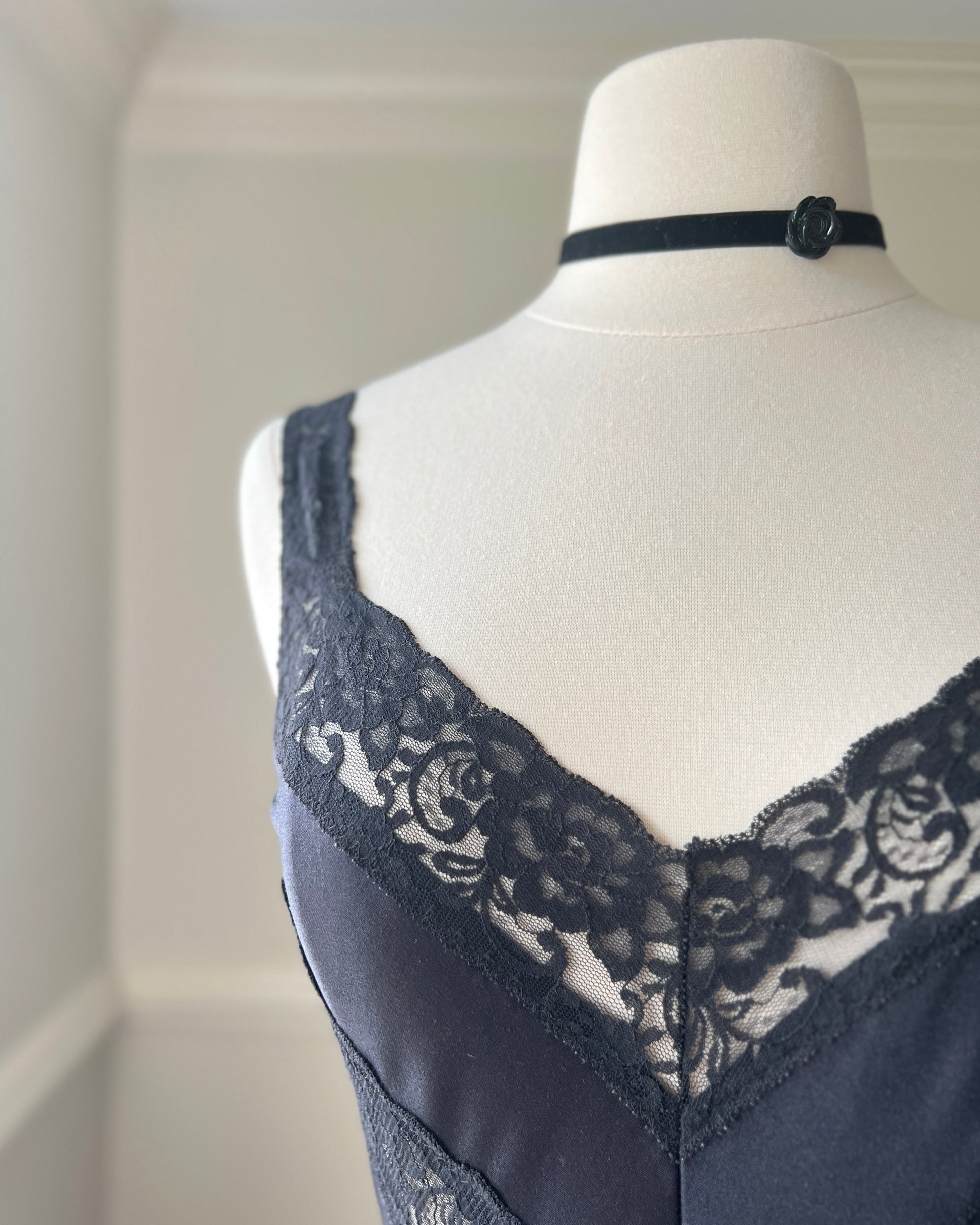 ༄ 80s elegant grunge satin maxi dress featuring V lace cutout with pleated skirt