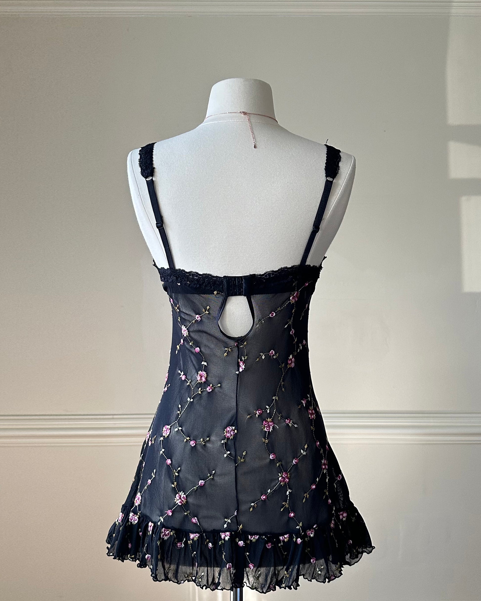 - Dark feminine bustier corset dress featuring rose vines embroidery with ruffled hemline trimmings and framed bodice