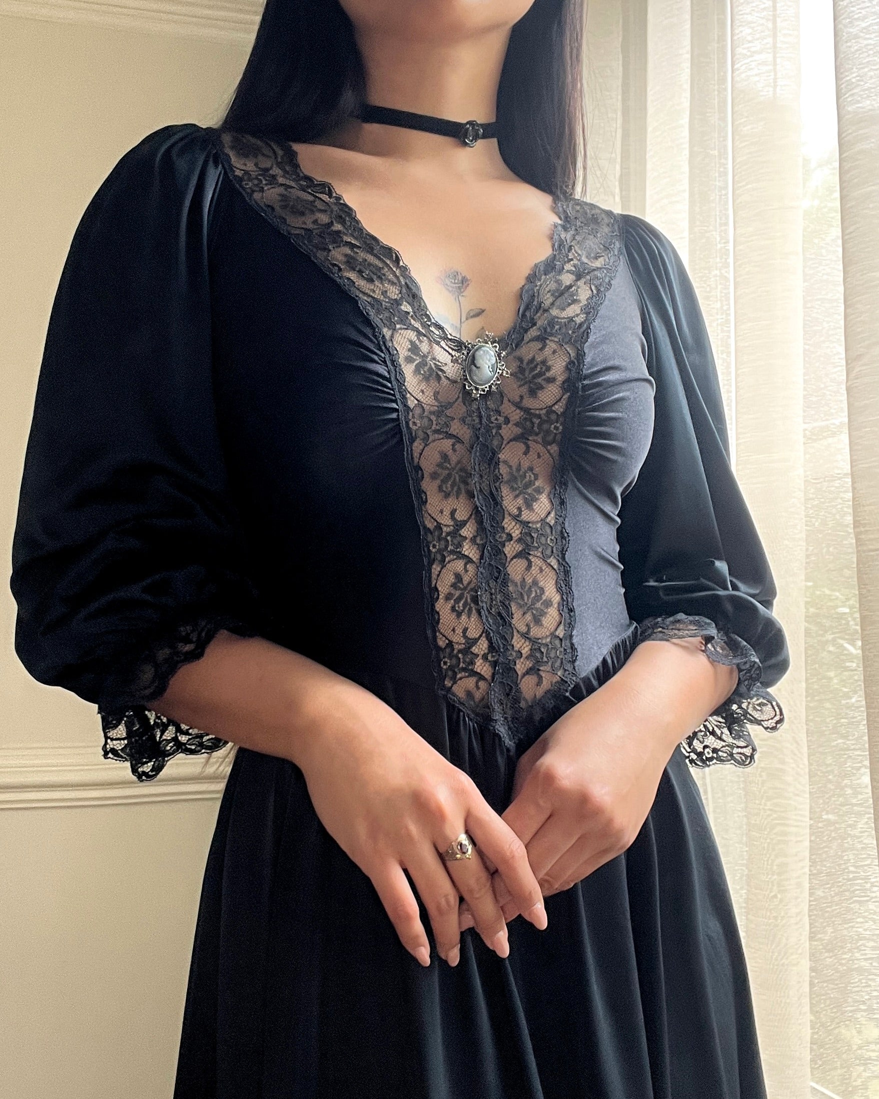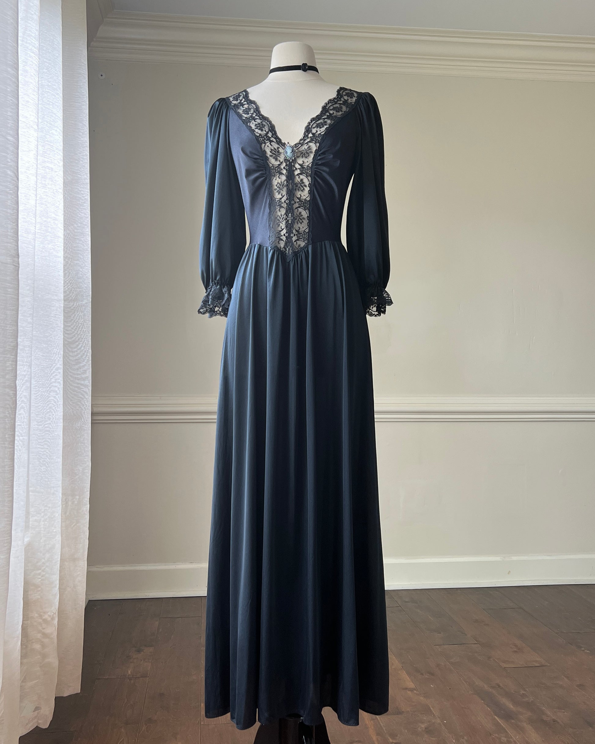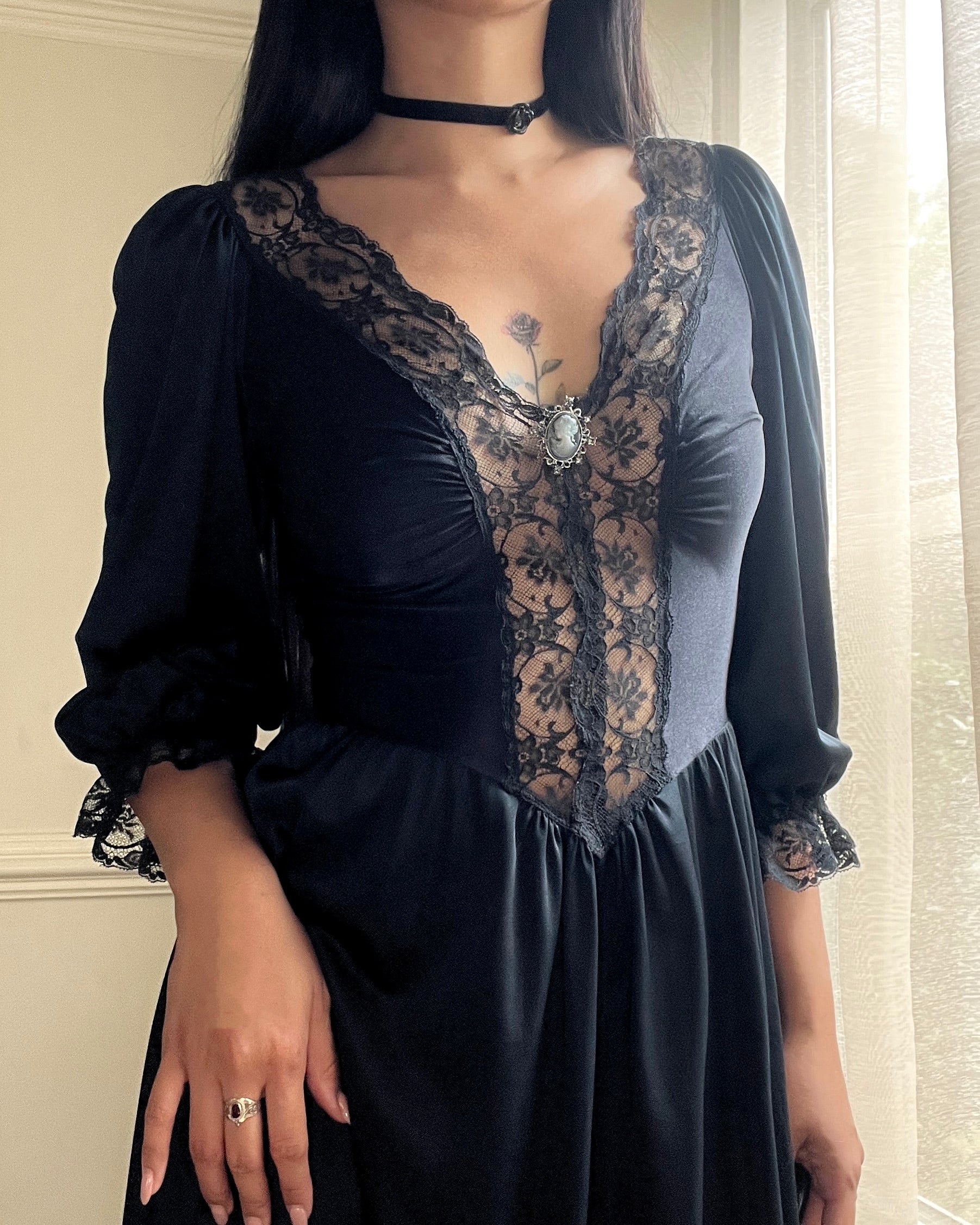 ༄ Dark Victorian satin maxi dress featuring intricate lace bodice details with a Victorian brooch attached