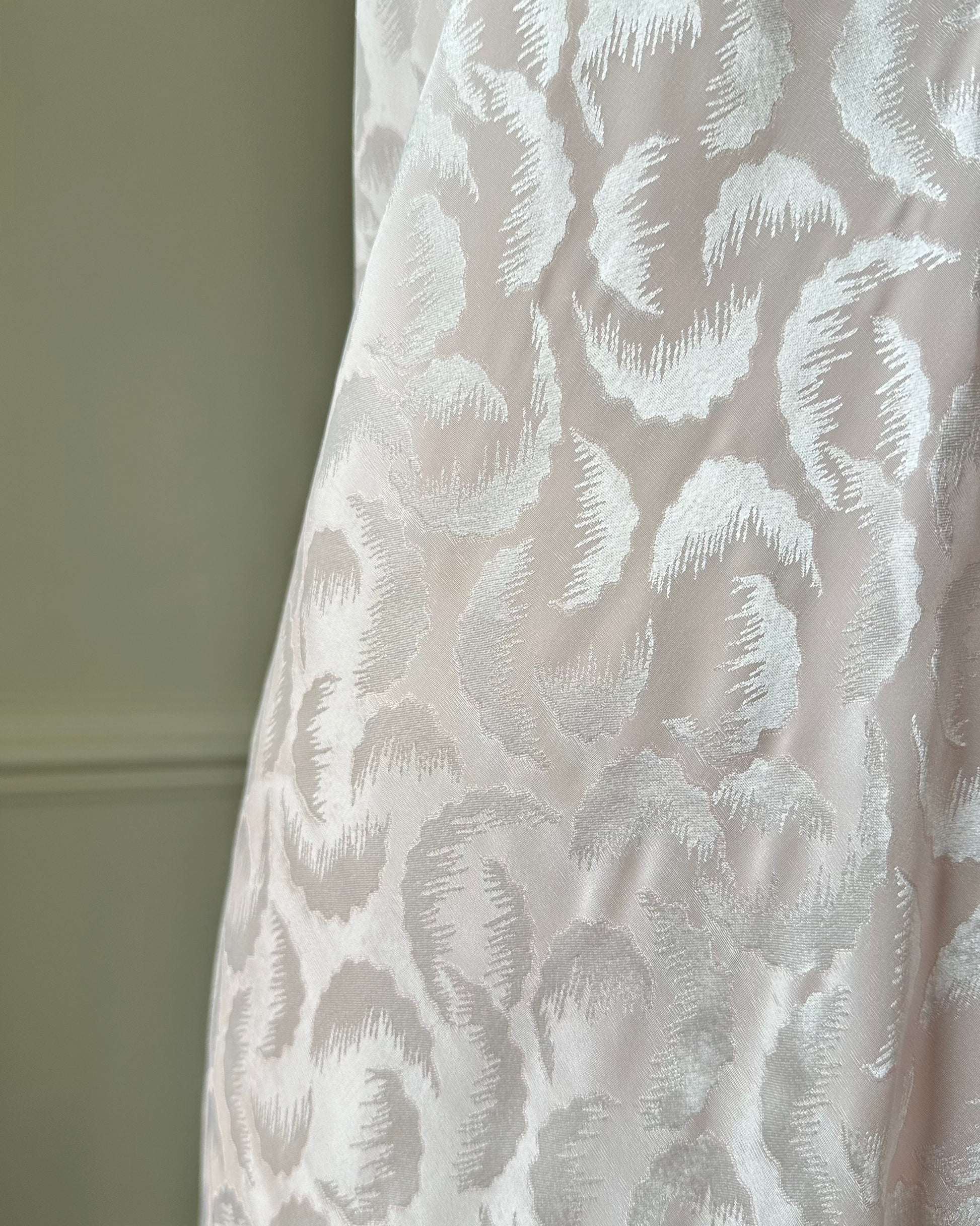 - Elegant soft pink maxi dress featuring luxurious satin fabric embossed with a silvery feather pattern with laced bustier