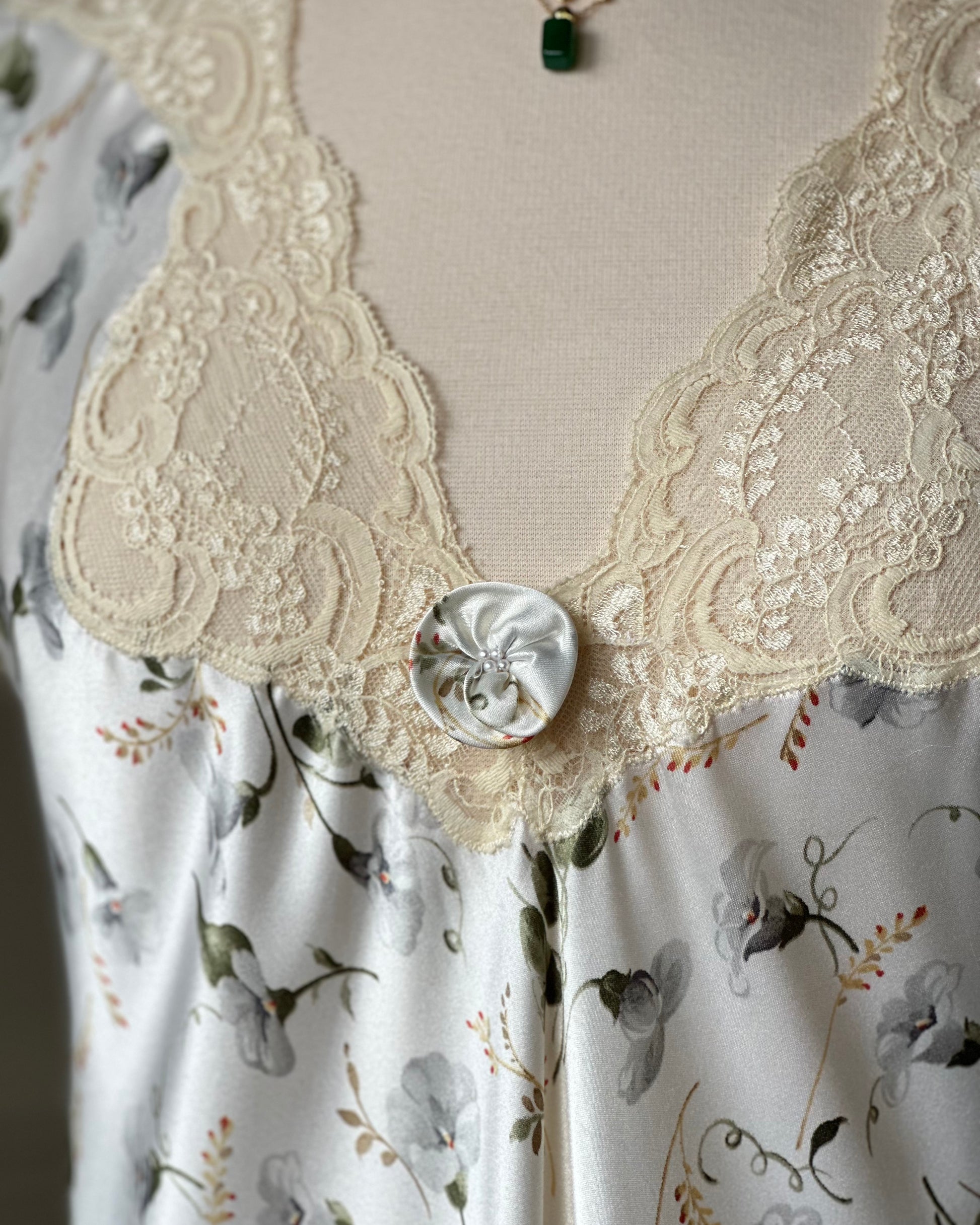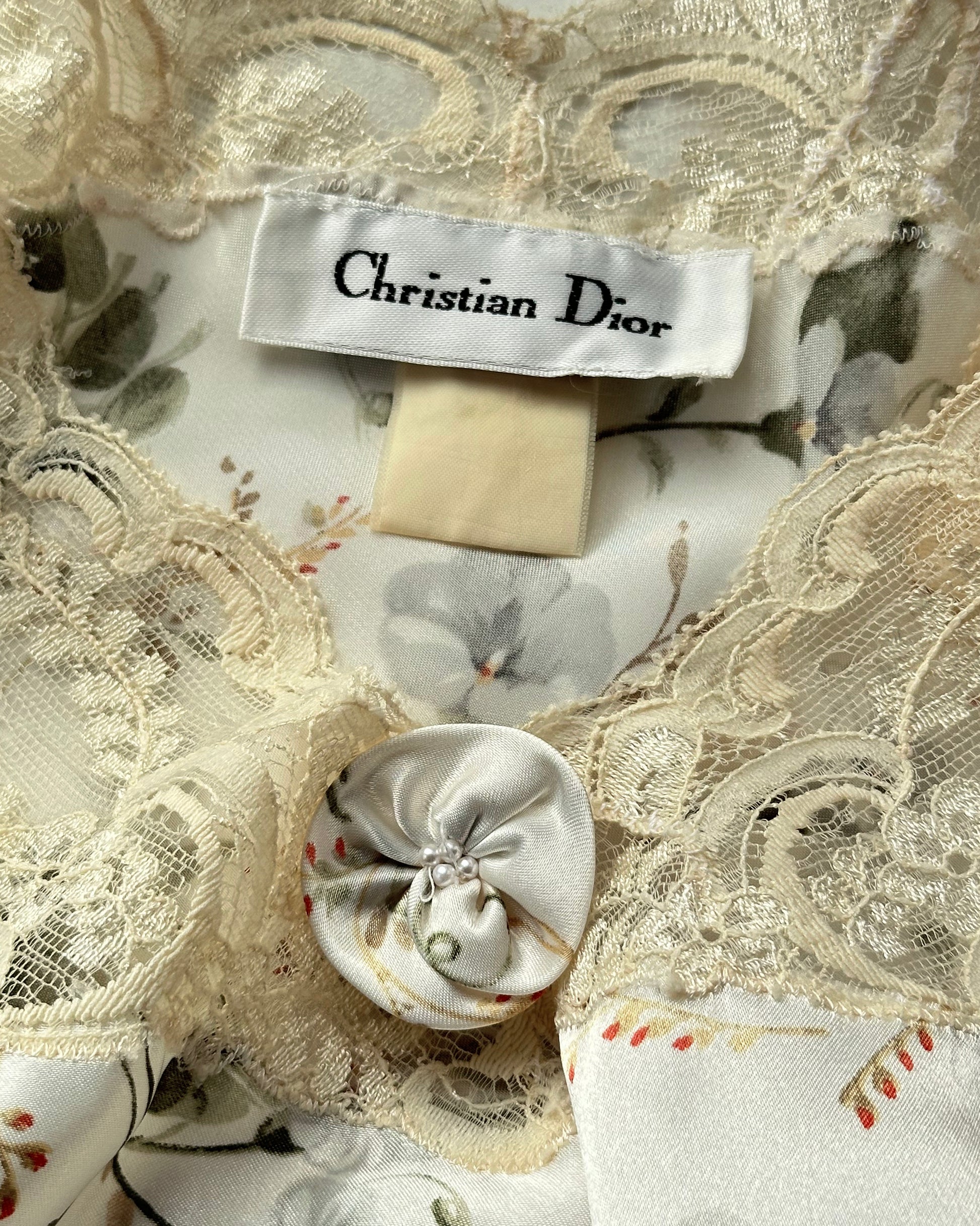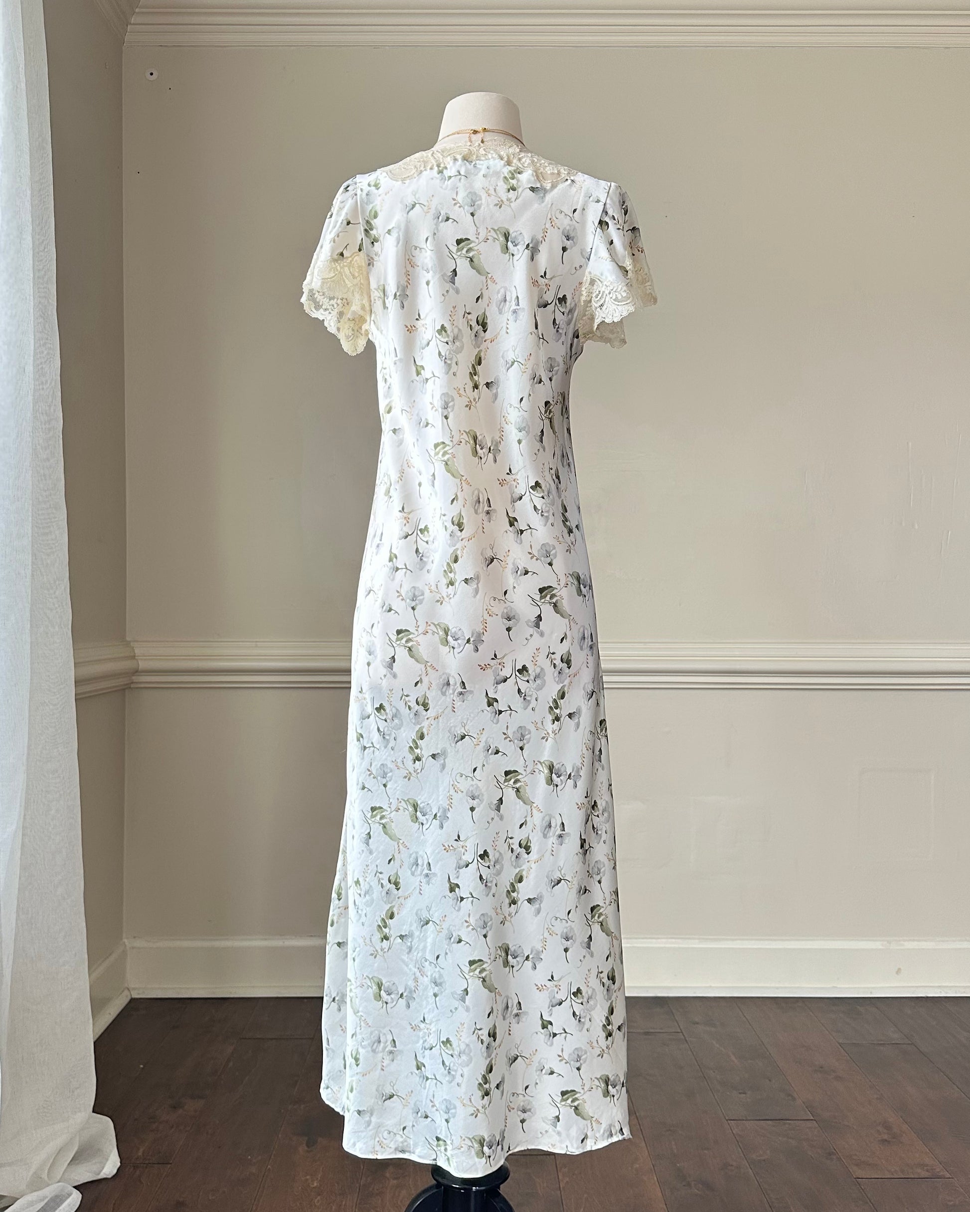 - Elegant vintage Dior satin maxi dress featuring white peony prints with sheer lace em details on bust and sleeves