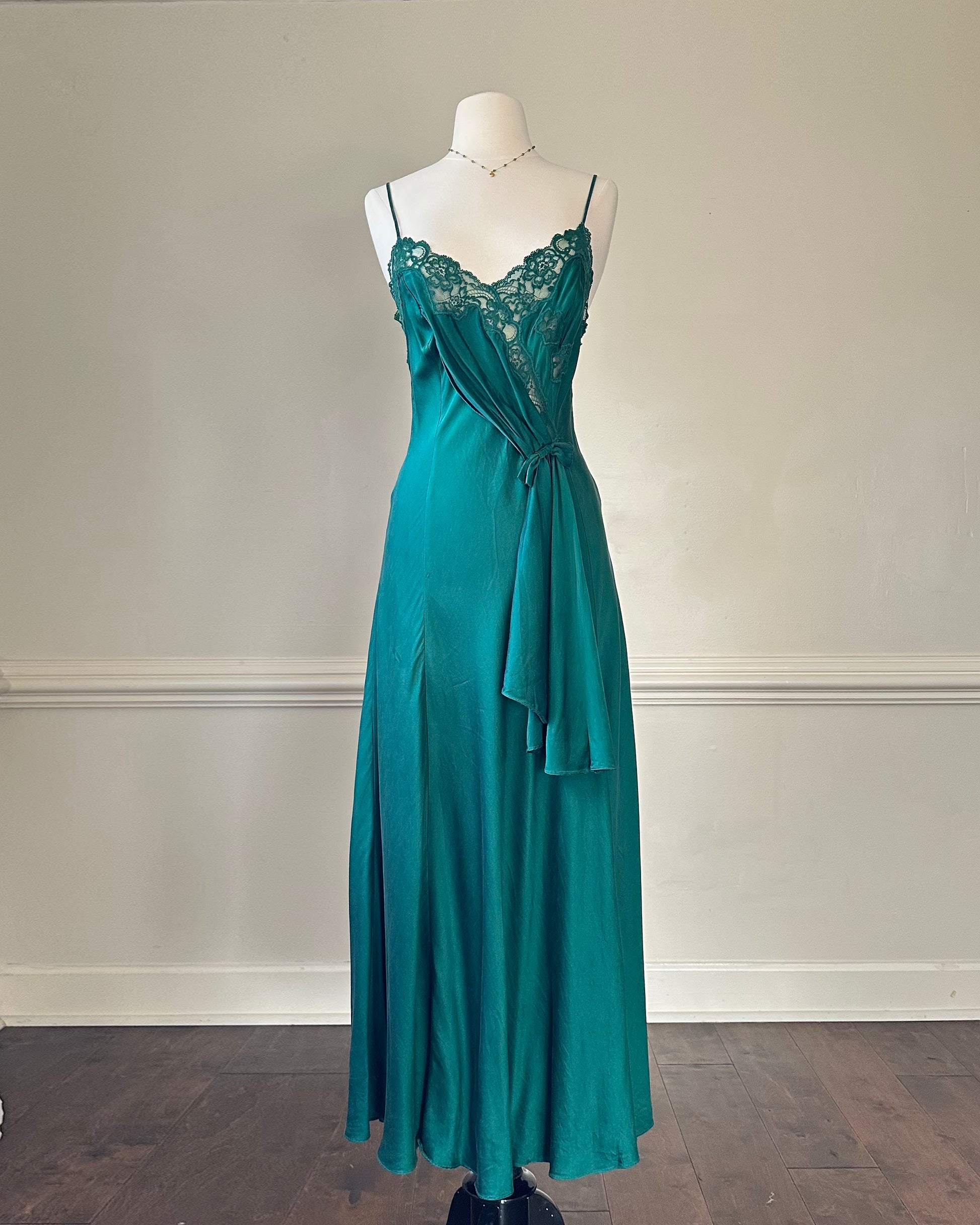 - Victoria's Secret emerald maxi dress featuring floral embroidery bust with bow tied drapes detail