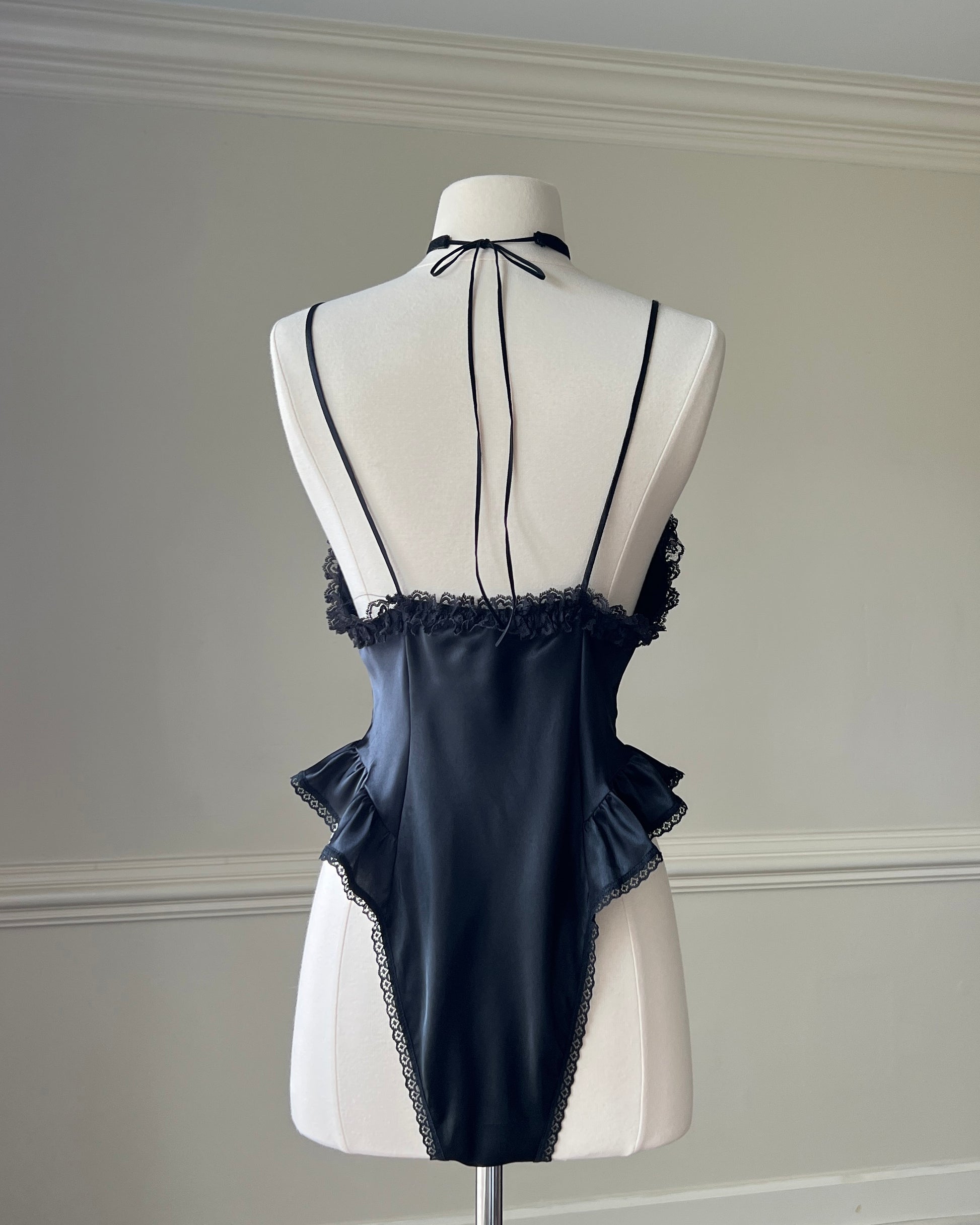༄ Delicate bodysuit featuring laced bodice cutout with floral embroidery and ruffled trimmings