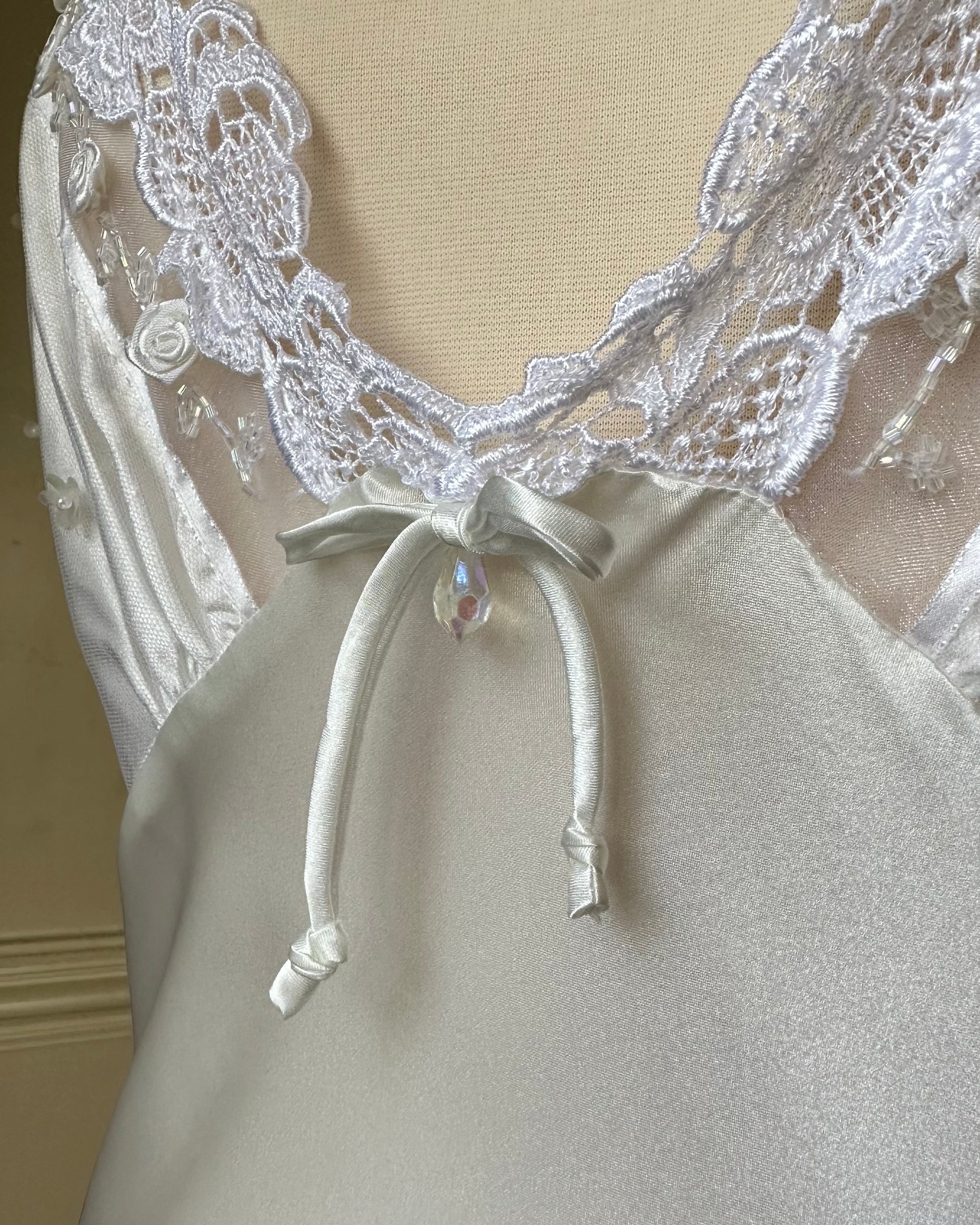 Sultry satin maxi slip dress featuring lace embroidery lining with satin rosettes adorned on bustier