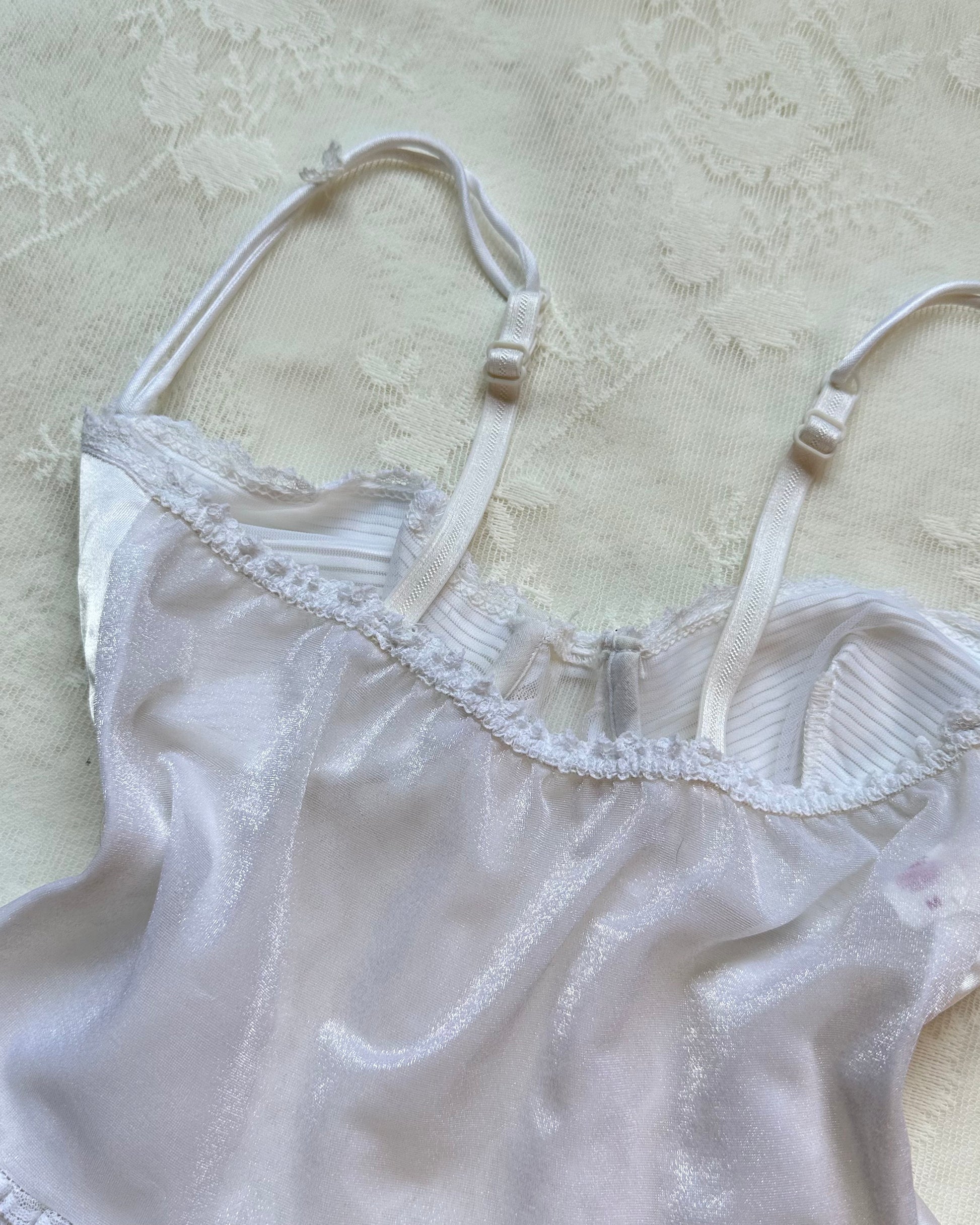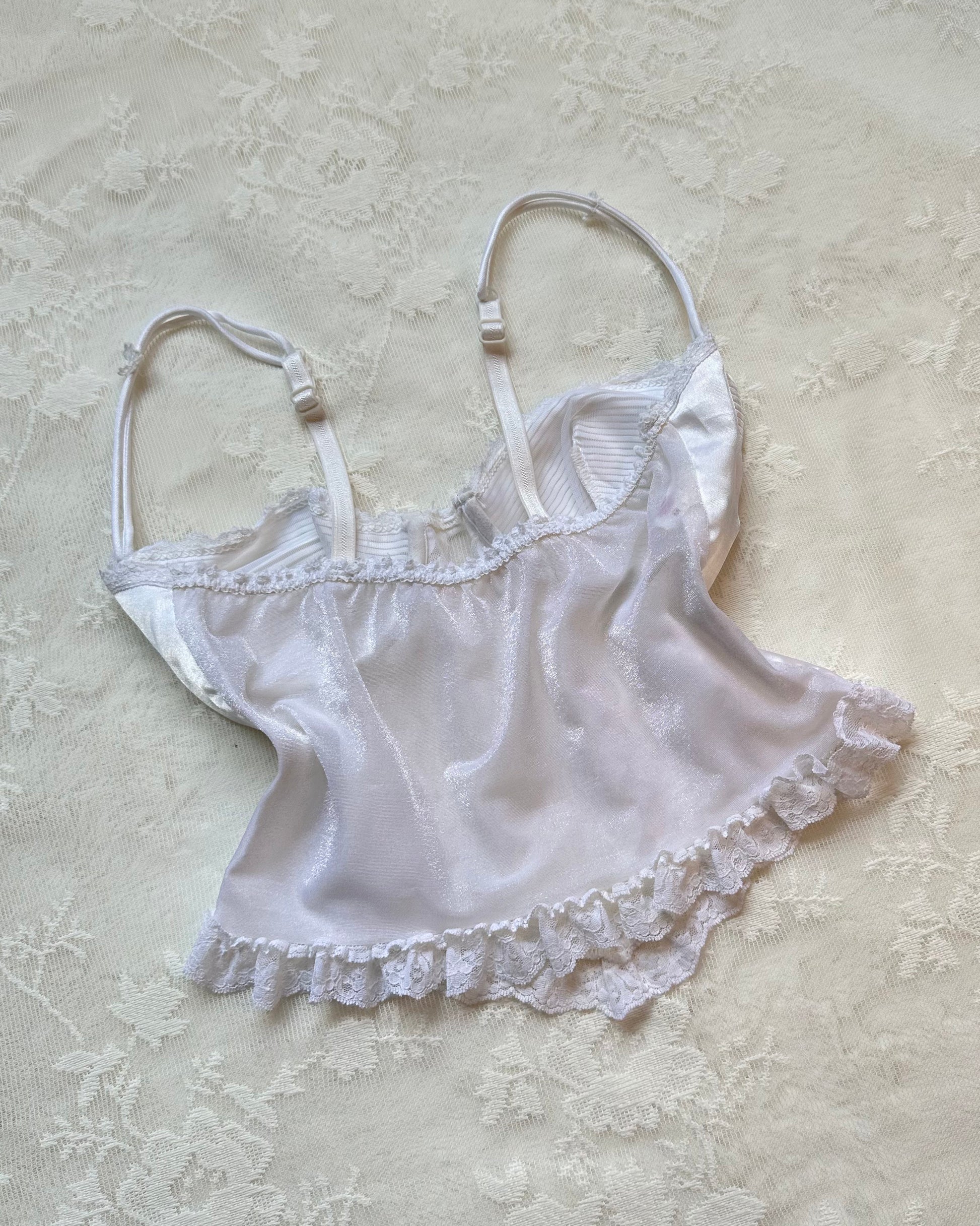༄ Cropped corset-style camisole featuring cup outline with brocade embroidery and ruffled trimmings