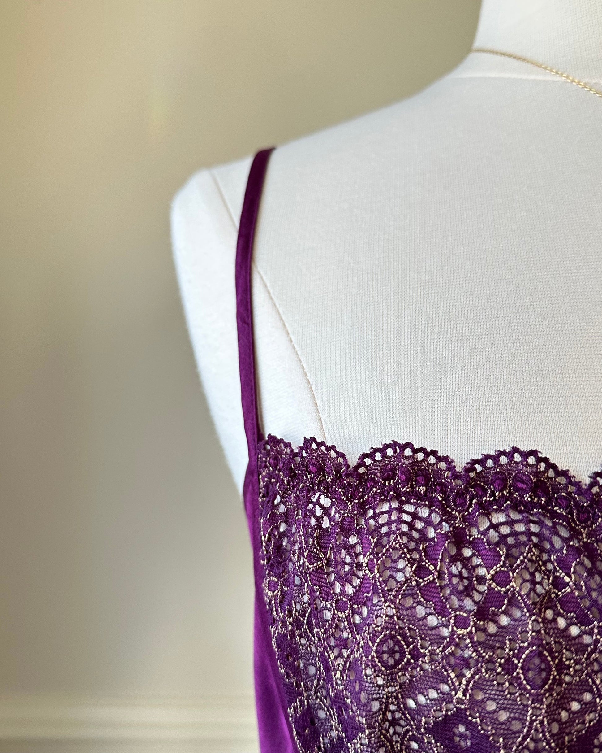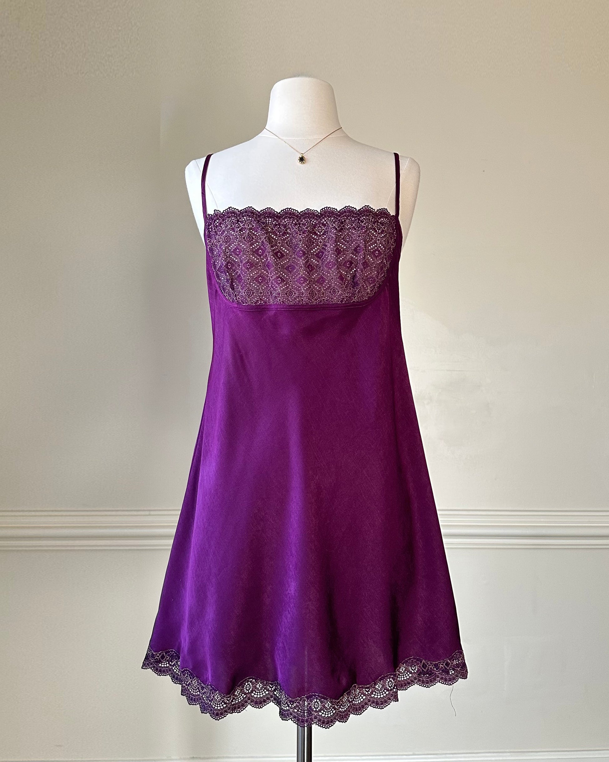 - Vibrant purple Victoria’s Secret satin slip dress featuring lustrous bodice adorned with intricate lace detailing and a straight neckline.