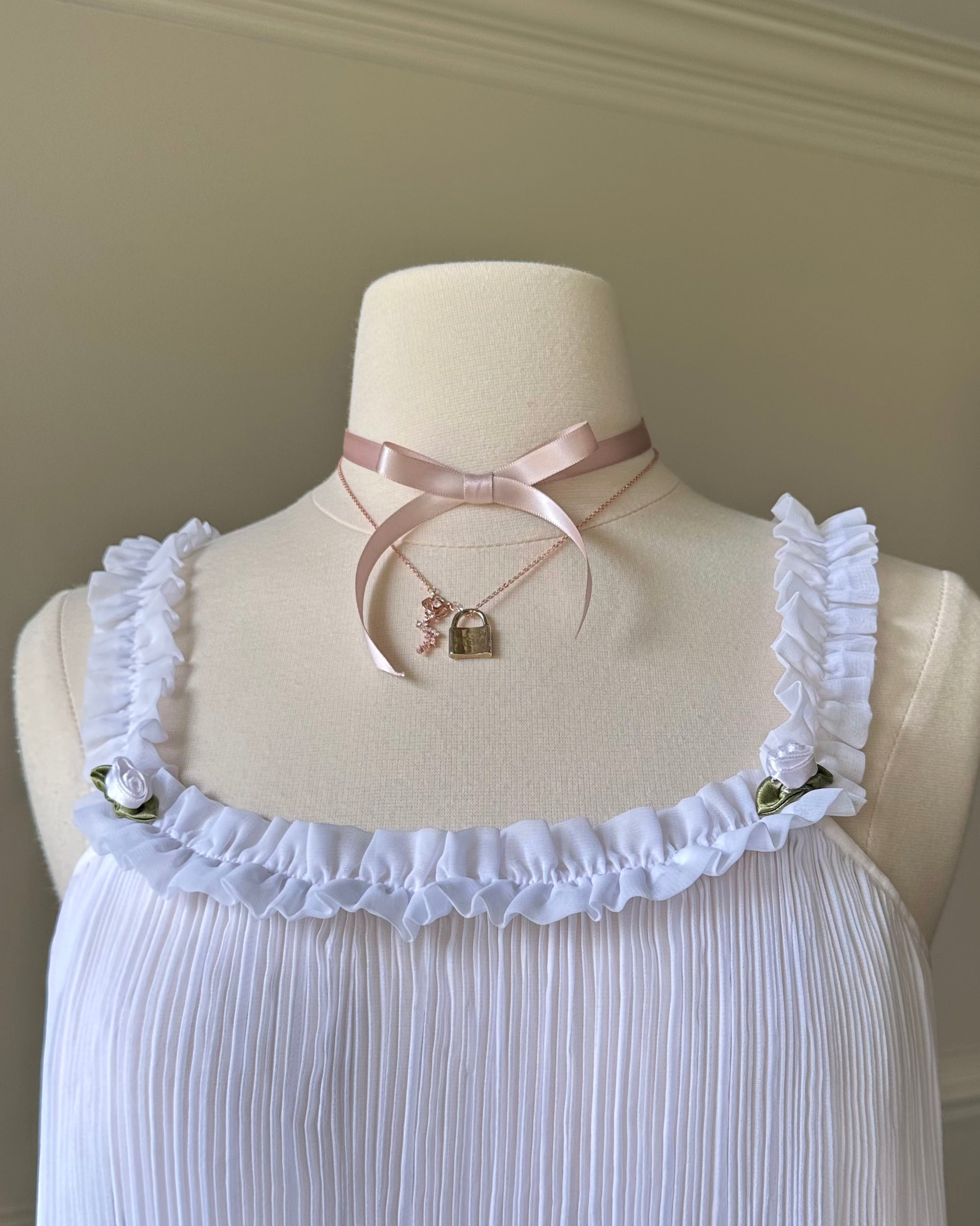 - rosette adorned; scooped back; style worn by Sabrina Carpenter