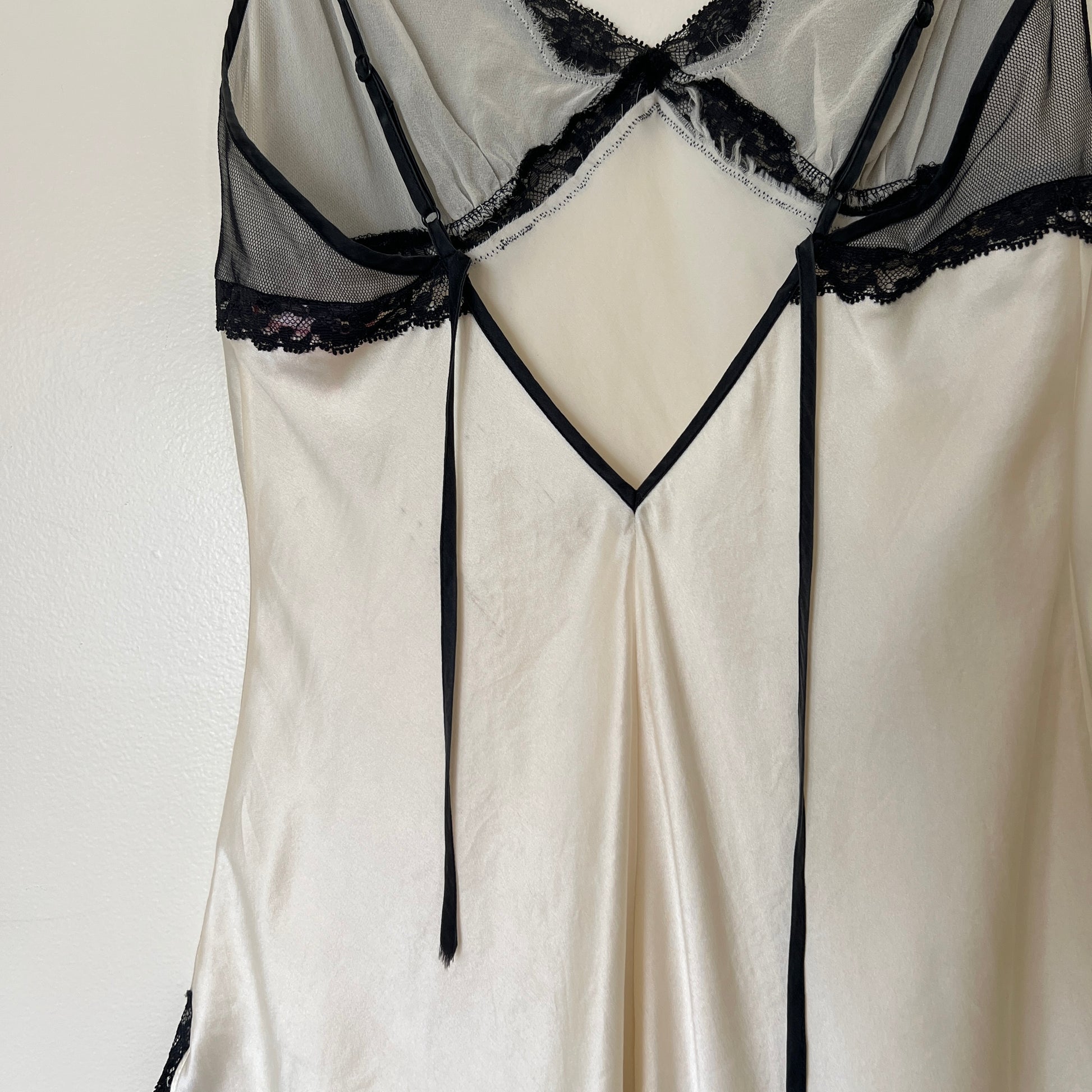 ༄ Victoria’s Secret silk slip dress in vintage cream featuring rosette embroidery details with sheer mesh bustier