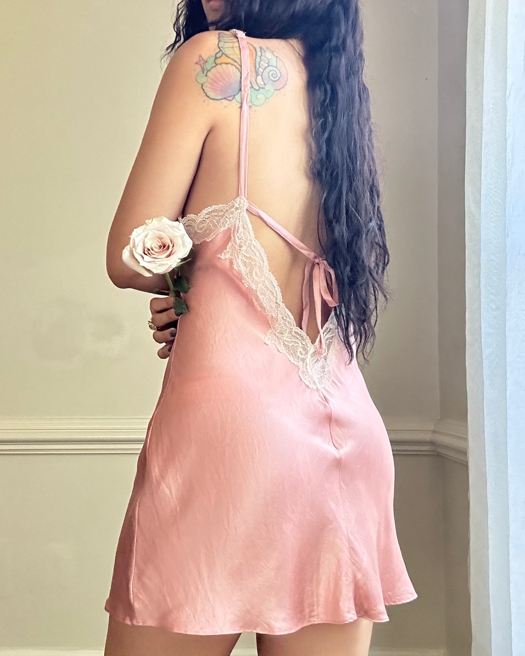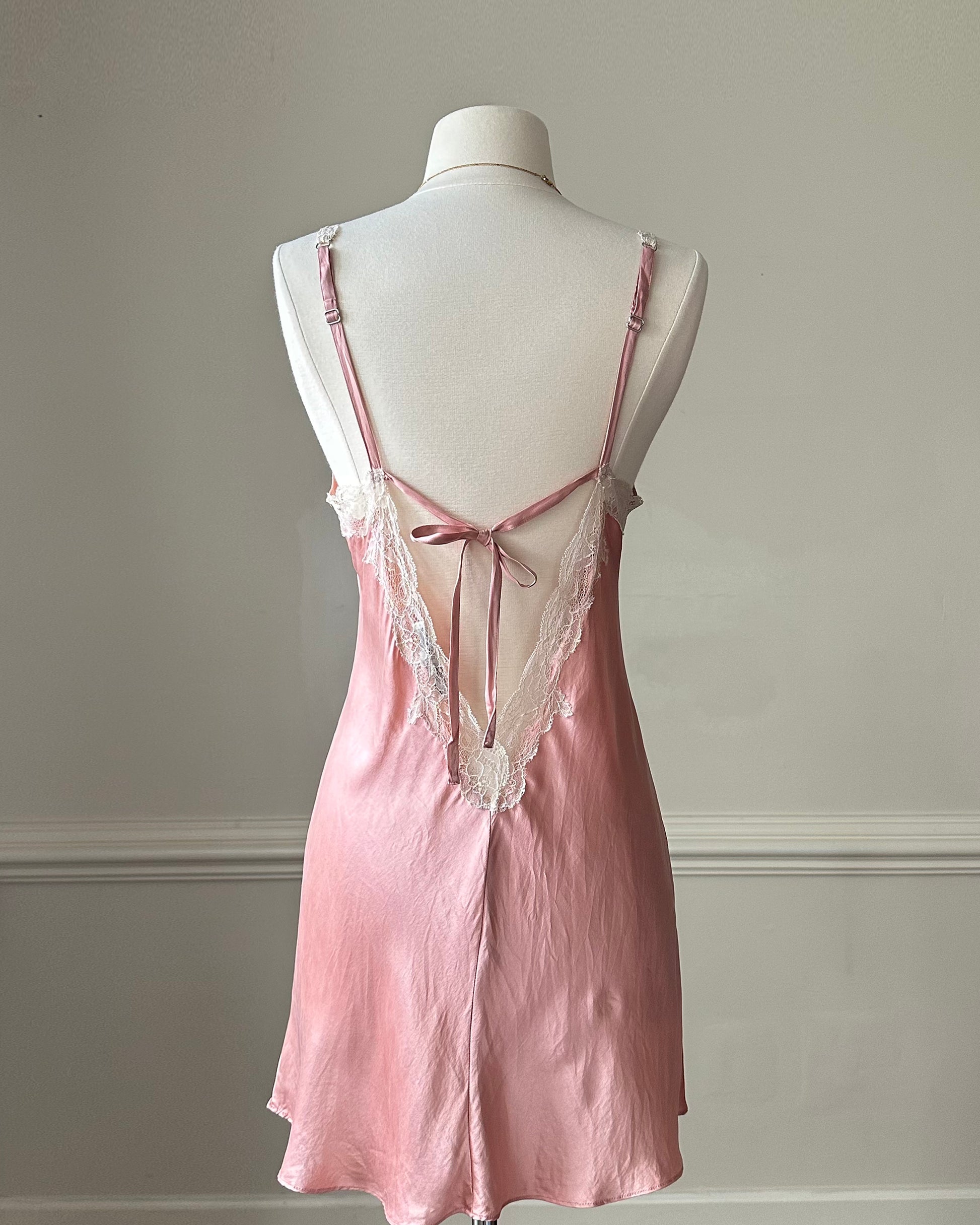 - Victoria’s secret sunset pink silk slip dress featuring floral embroidery cup with v-cutout back lined with lace details