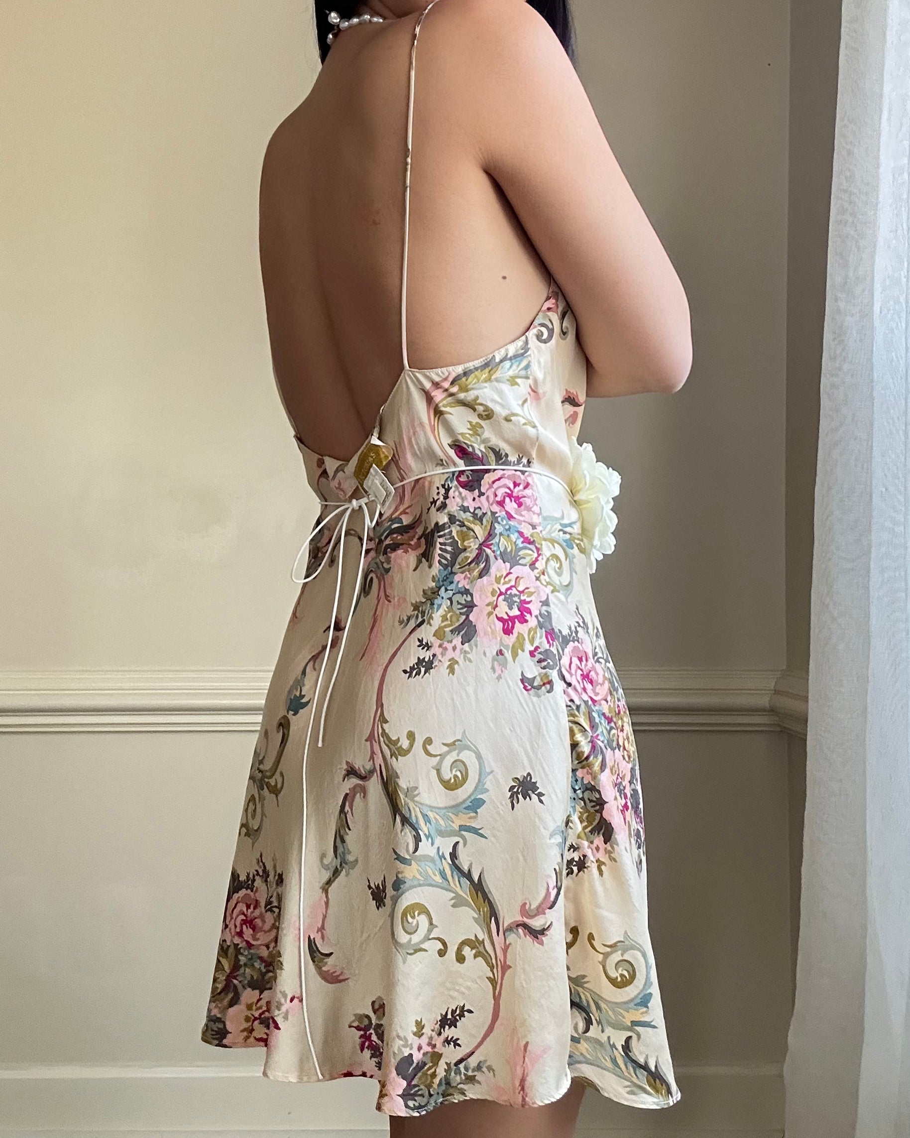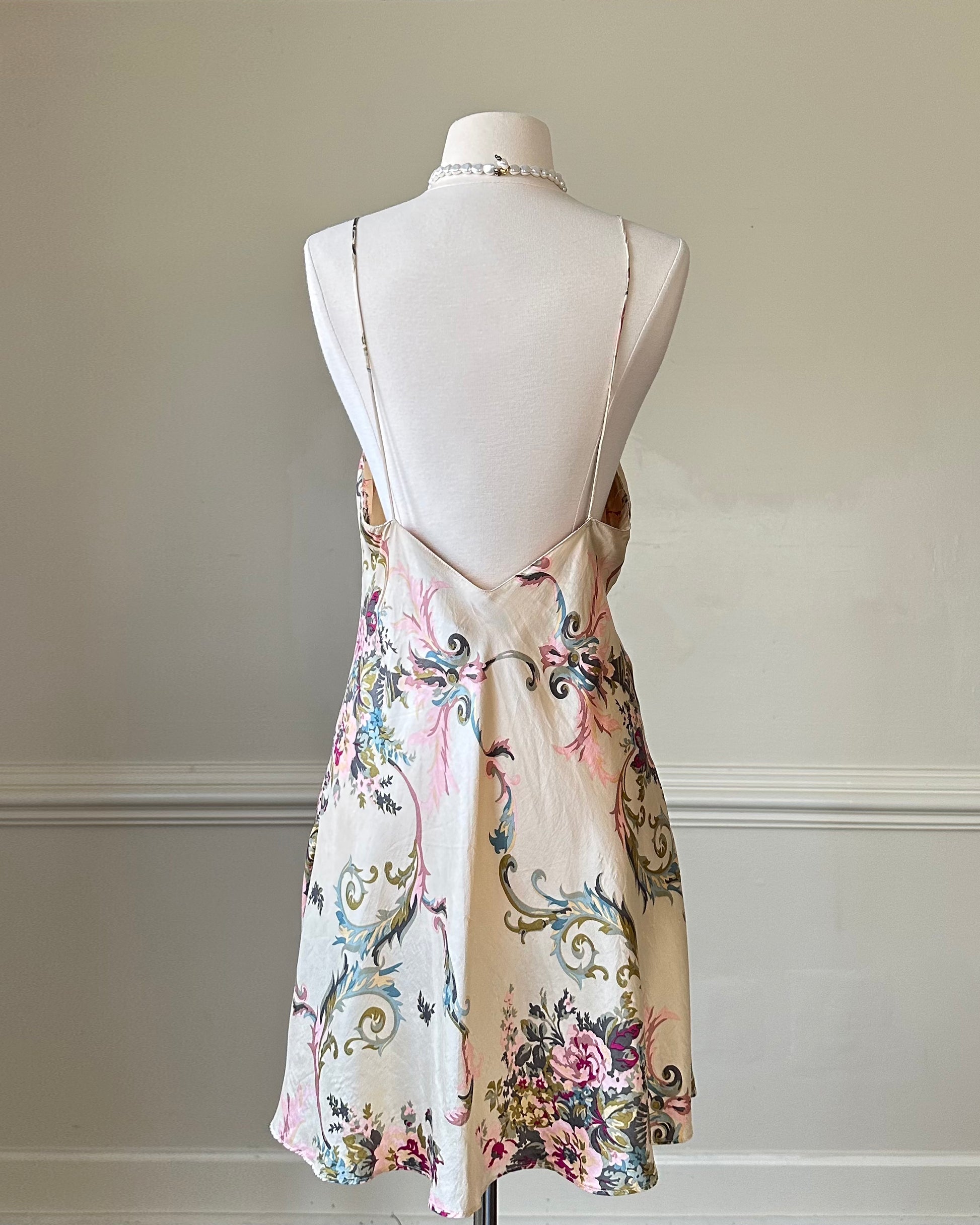 Victoria’s Secret vintage floral slip dress featuring vibrant flower bouquet print on satin fabric with v-neckline