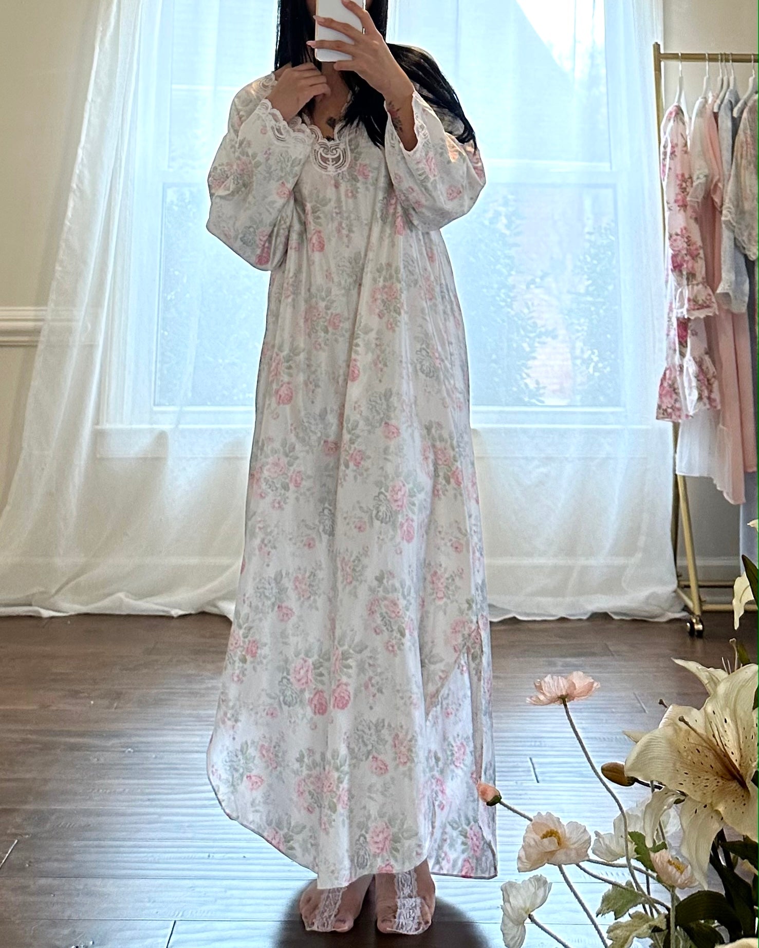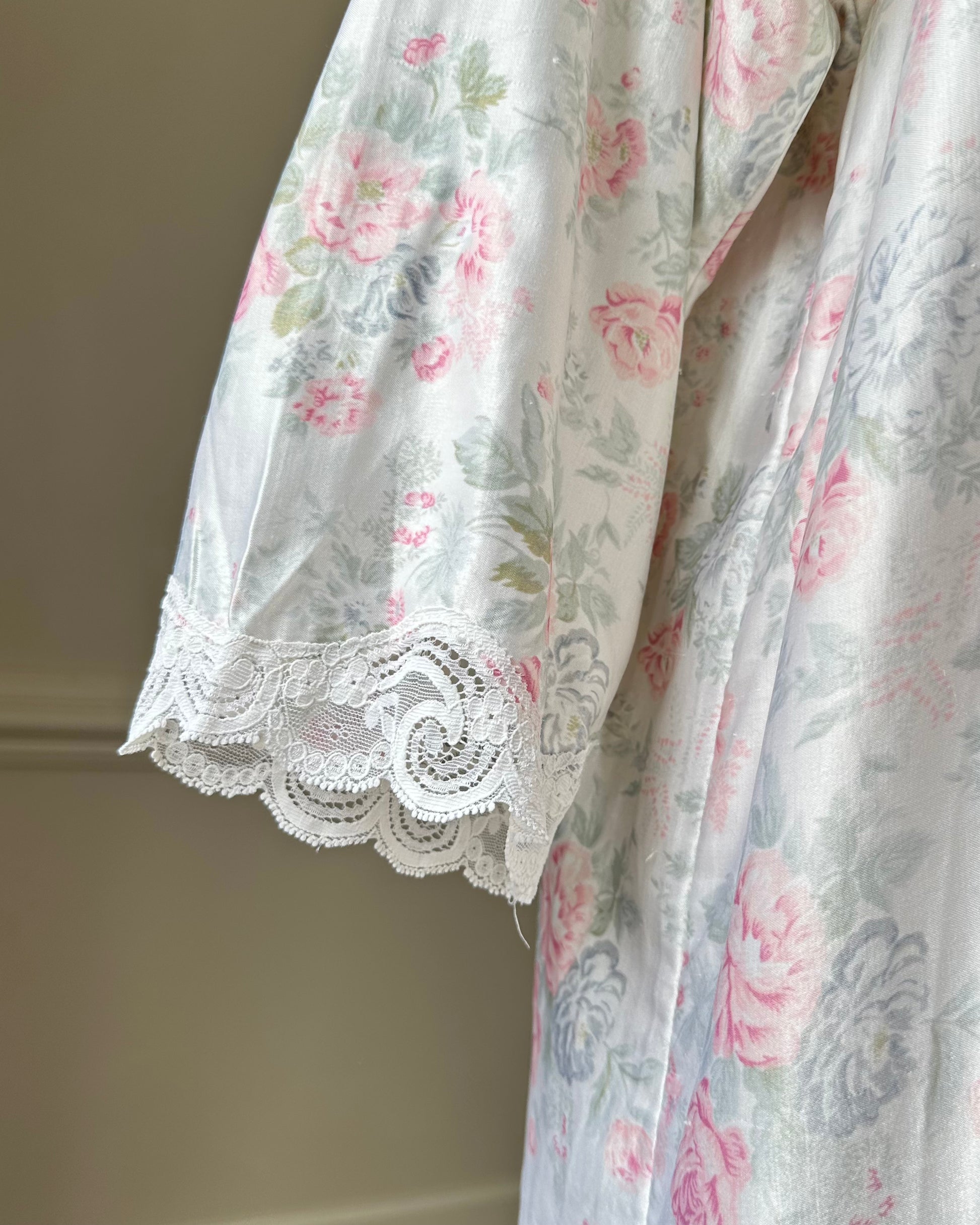 - Vintage Barbizon maxi dress featuring rosette prints on satin fabric with sheer lace trimmings