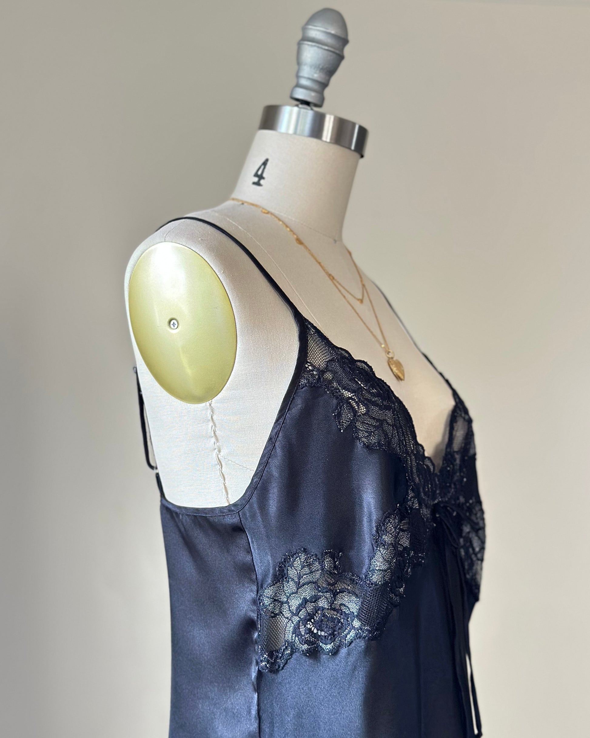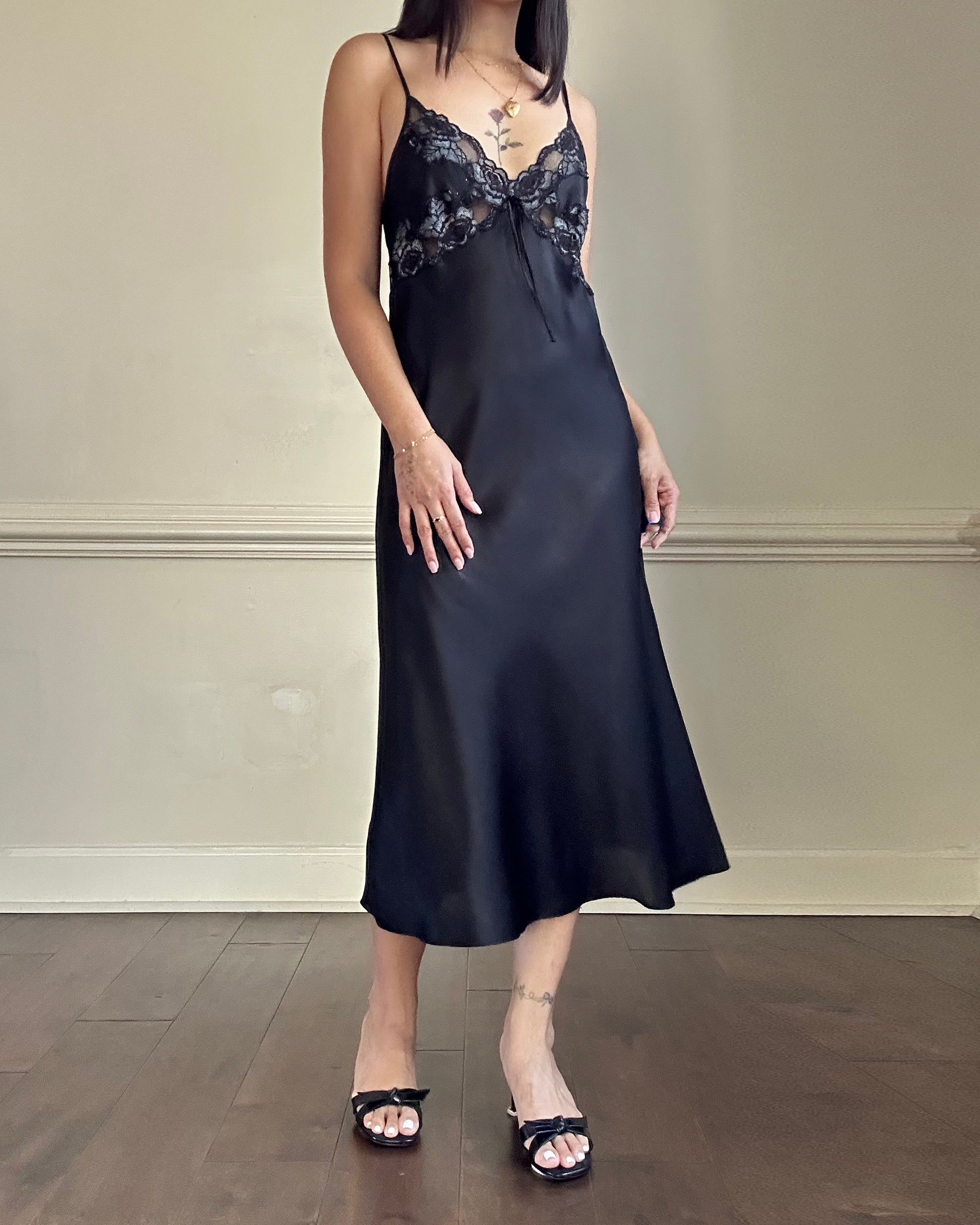 Elegant 90s black satin-feel slip with sheer floral lace bust and bow detail