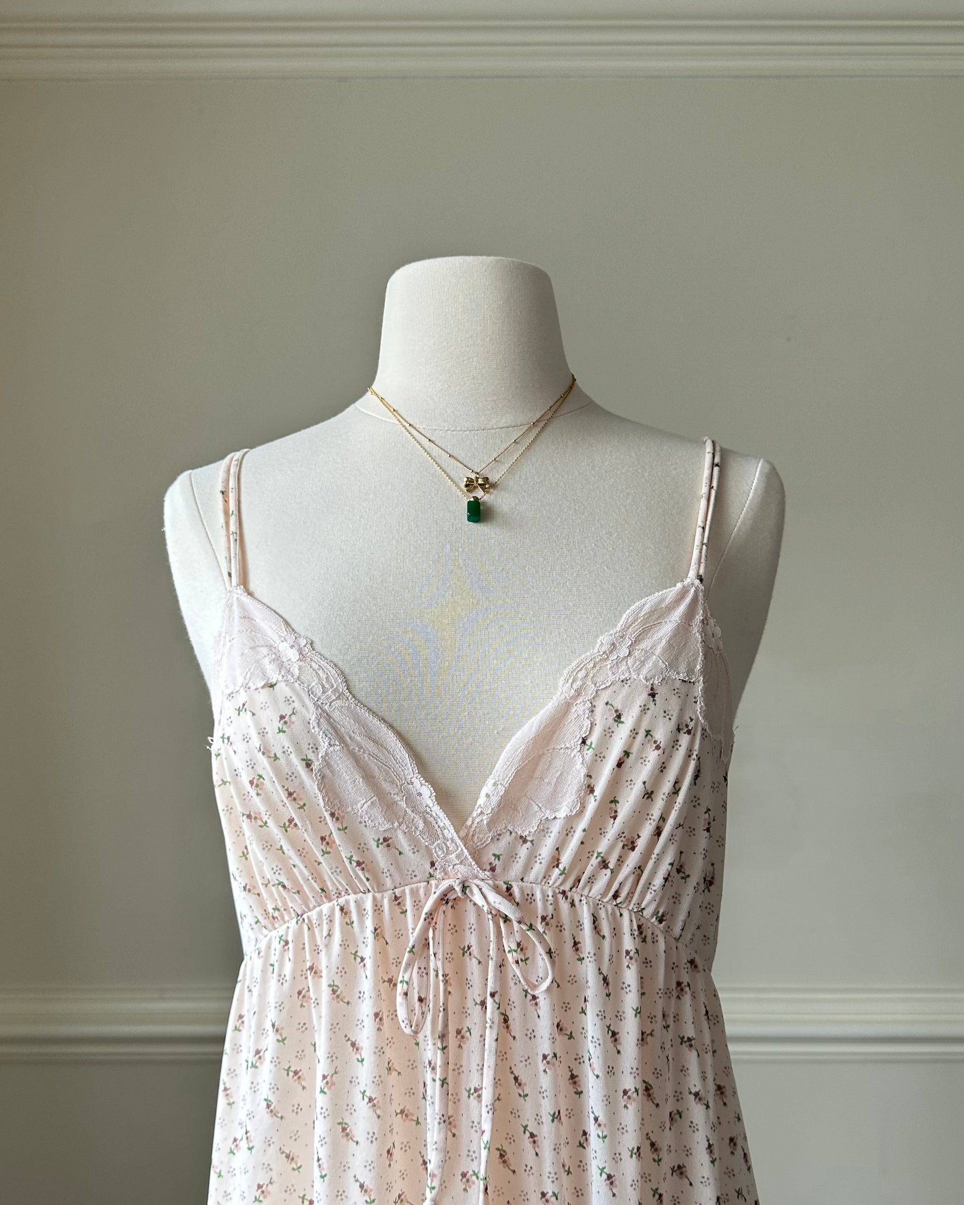 - Vintage maxi dress featuring ditsy floral prints on sheer blush pink fabric with embroidery details on bust