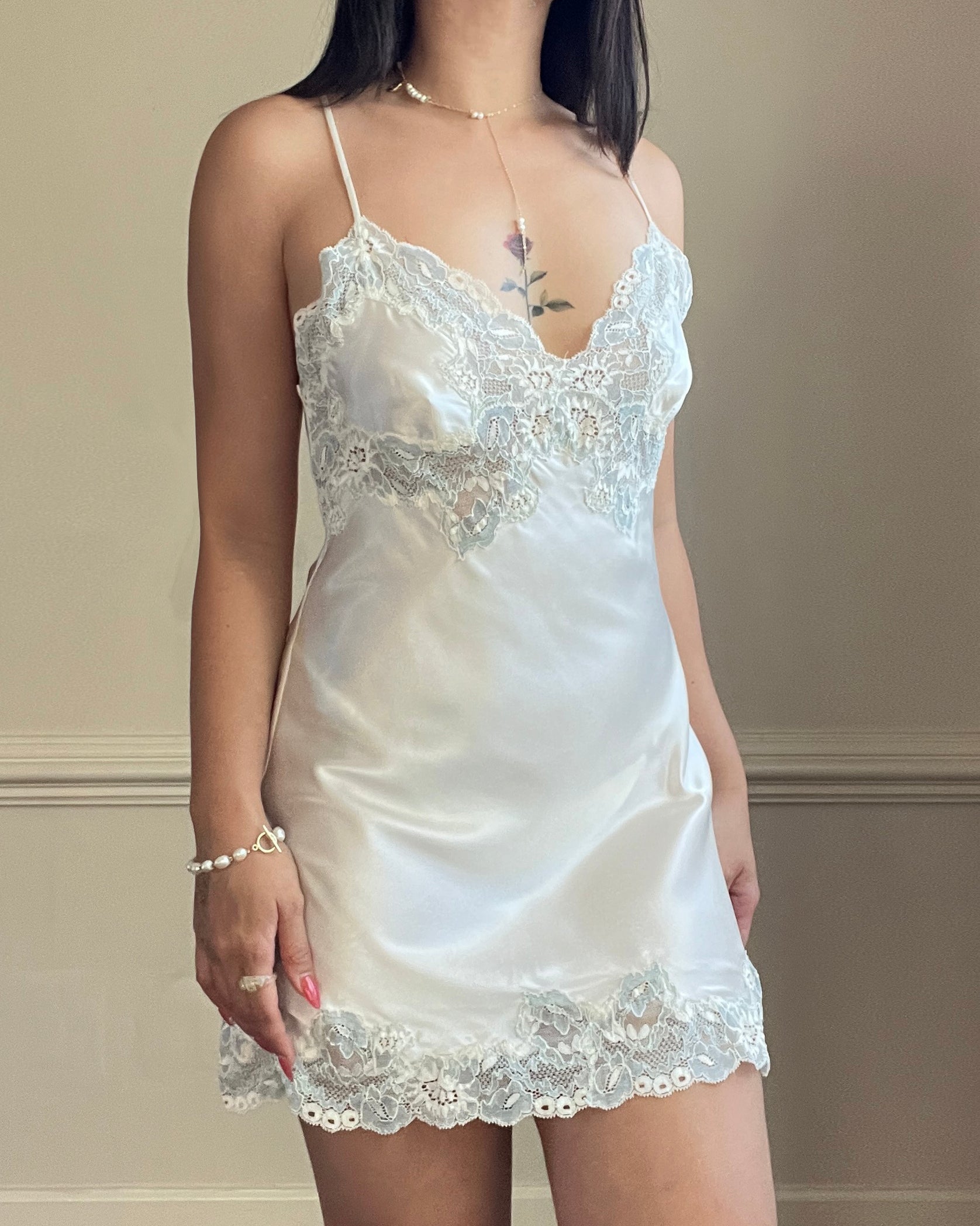 Vintage Victoria’s Secret pearl satin mini slip with blue lace