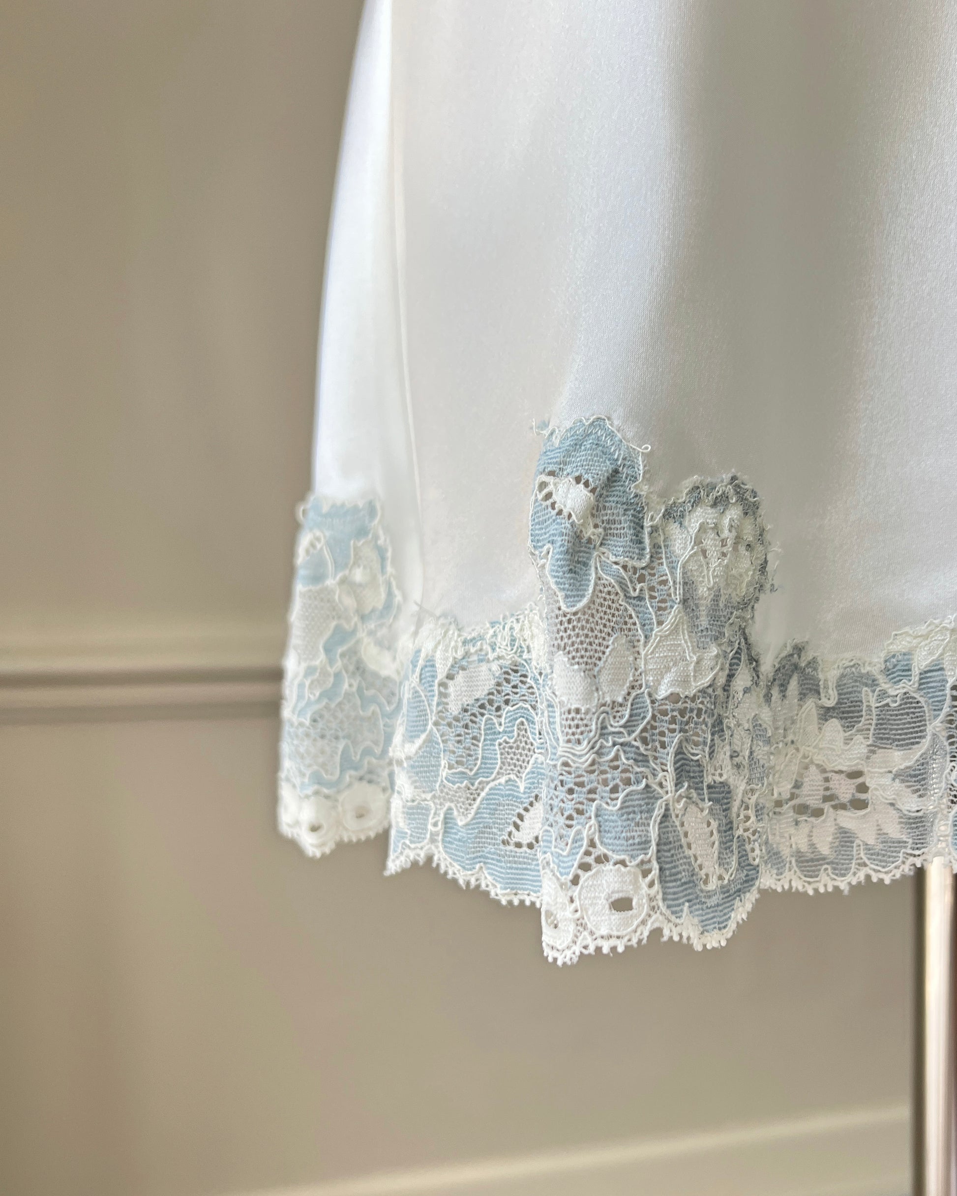 – Features soft pearl satin body with baby blue and cream floral lace bust and hem